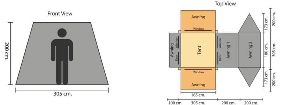 Awning ของตัวเต็นท์ด้านหน้าสามารถกางขยายออกมาได้ยาว 2m. และ 4m. สามารถรูดซิปติด Side Awning รูป 3 เหลี่ยมด้านข้างได้ ส่วน Awning ด้านหลังยาว 1m. Awning ของเต็นท์สามารถปรับเปลี่ยนรูปทรงได้หลายรูปแบบขึ้นอยู่กับความสูงของขนาดเสา