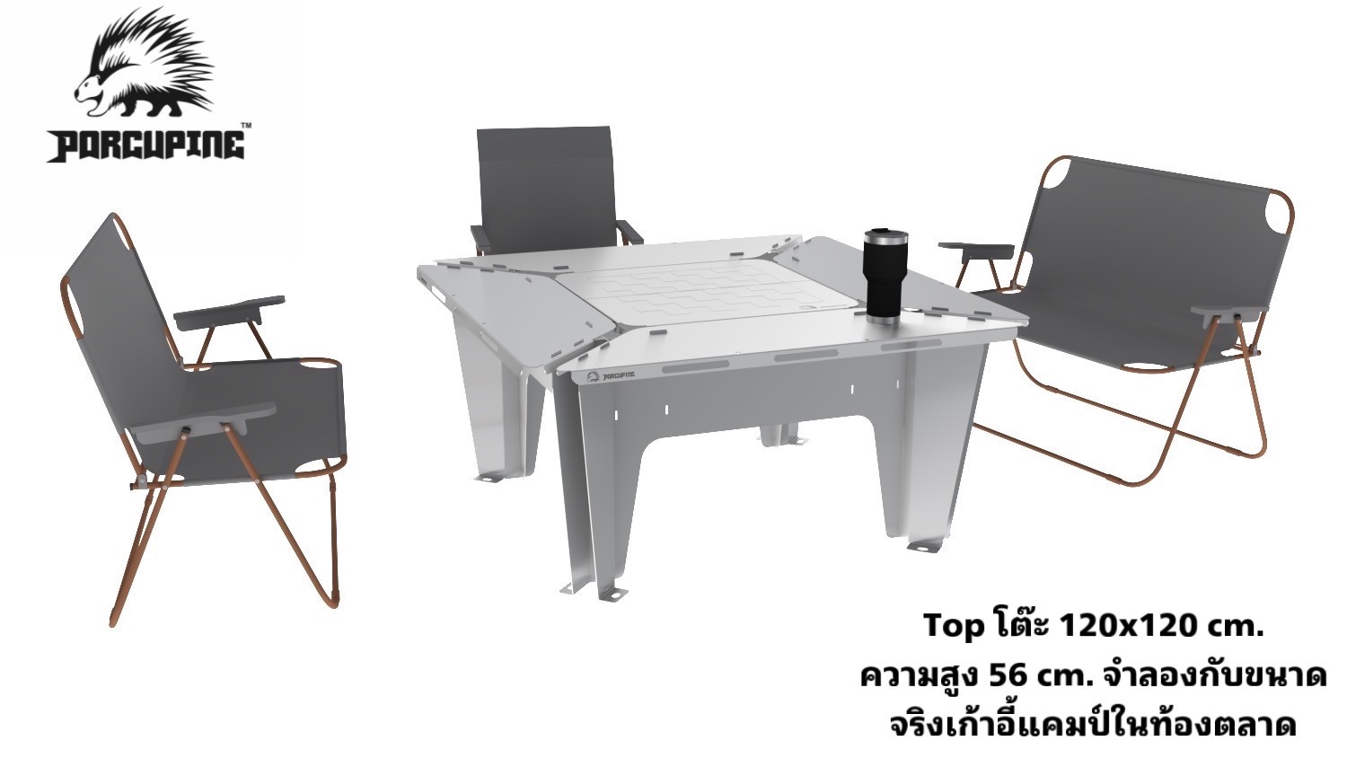 โต๊ะแคมป์ปิ้ง PORCUPINE ผลิตจากวัสดุ Stainless 304 ขนาดหน้า TOP 120x120 cm. พร้อมแผ่นปิดทึบหน้า TOP โต๊ะลายเลเซอร์มาร์กกิ้งตารางหมากฮอสแบบเท่ห์ๆ (สินค้าจริงจะจัดส่งแผ่นปิดทึบลายหมากฮอสแบบชิ้นเดียวไม่แยกส่วนเพื่อความแข็งแรง) สามารถยกแผ่นปิดทึบหมากฮอสออกเปิดโล่งแล้ววางเตาปิ้งย่างขนาดใหญ่ลงไปตรงกลางได้เลยเหมาะสำหรับใช้งาน 4-8 คนกำลังสวยเลยครับ