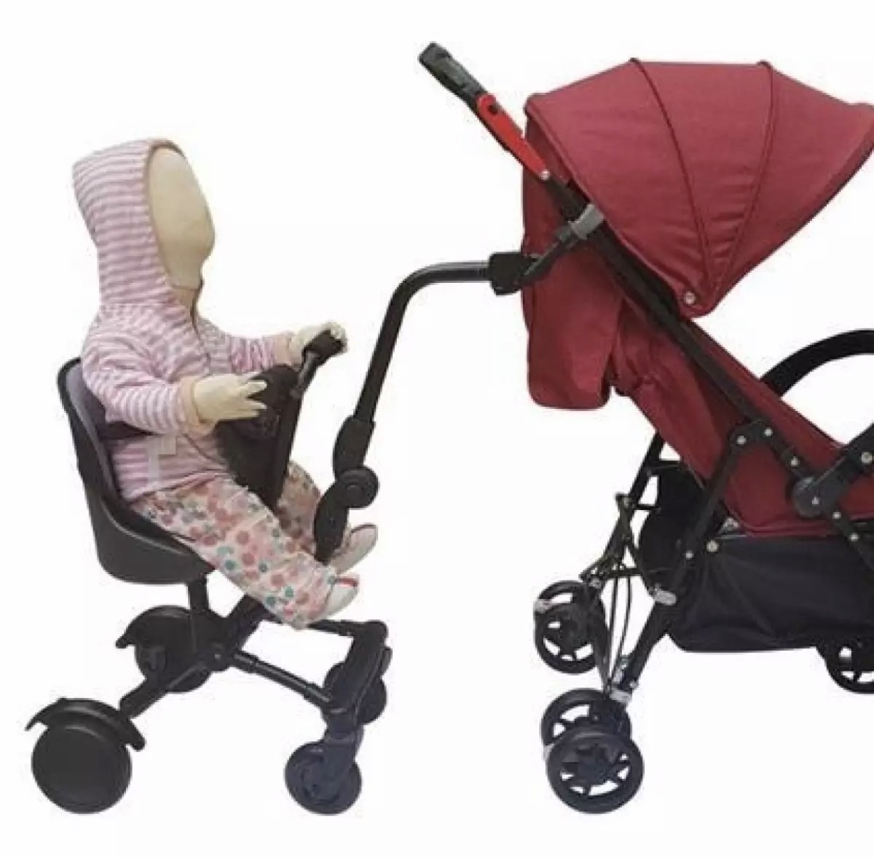 ????ต่อพ่วงด้านข้างรถเข็นได้ทุกยี่ห้อทุกรูปแบบ จึงทำให้เด็กที่นั่งรถเข็นด้านหน้ายังปรับนอนลงมาได้